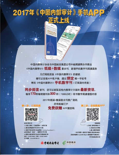 即刻扫描上图中二维码,安装APP并注册成功后可免费试用《中国内部审计》手机数字刊(2016年底前有效)。