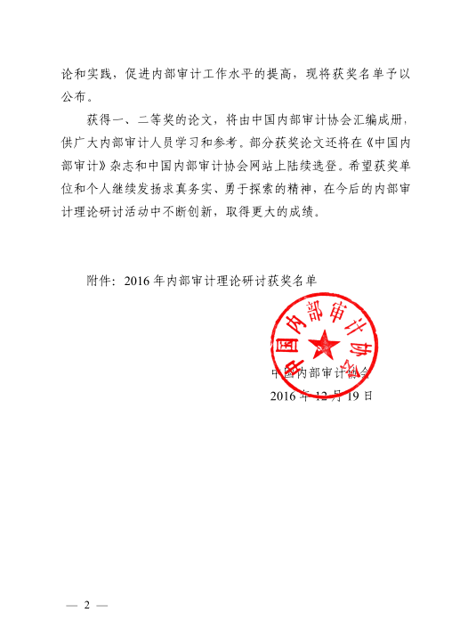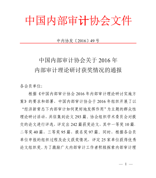 中国内部审计协会关于2016年内部审计理论研讨获奖情况的通报